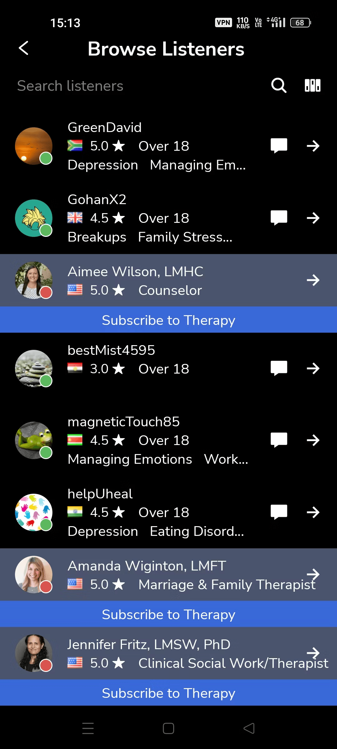 7 Cups is an online peer-to-peer support and professional counseling platform. With over 450,000 trained listeners, it offers:
