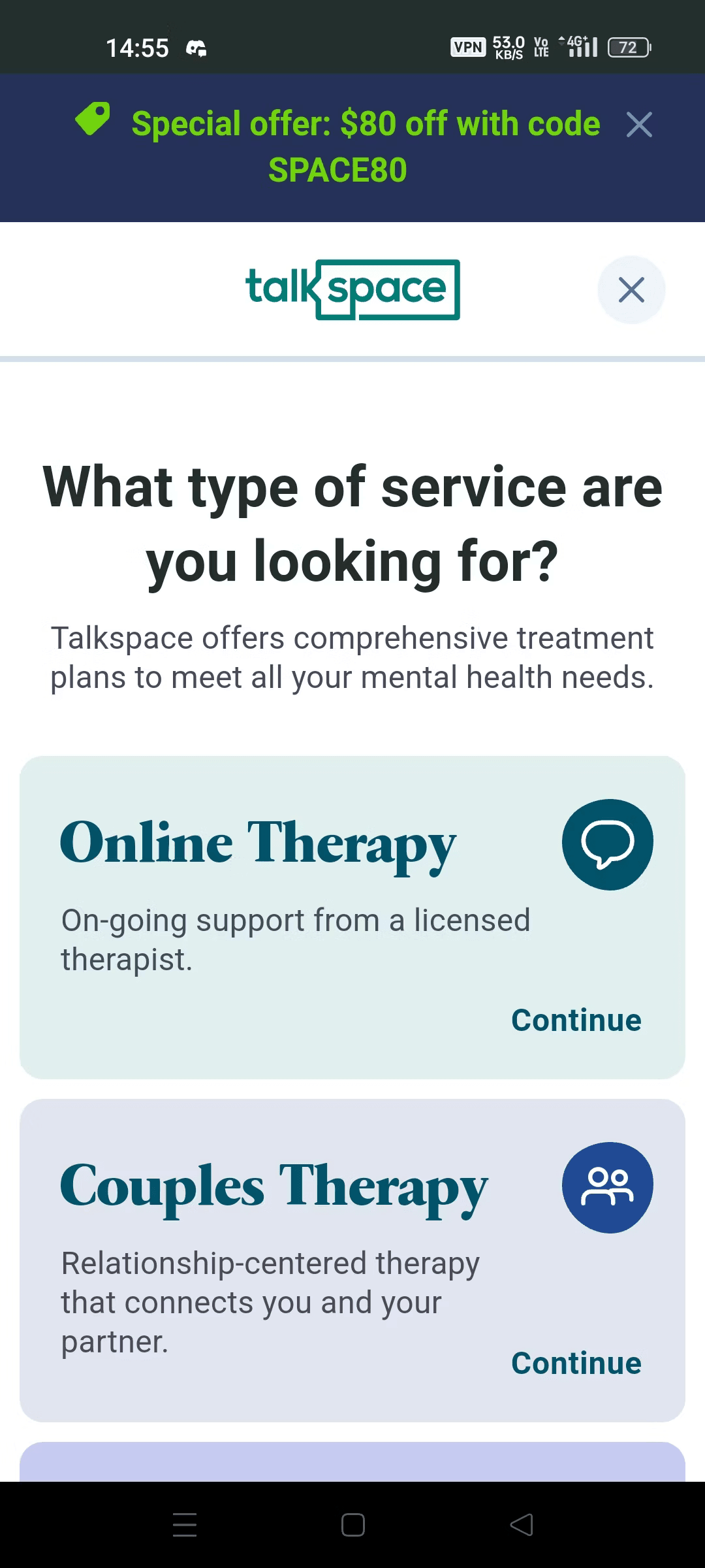 Talkspace provides various support plans, ensuring you get the level of care that suits your needs. They also offer additional services like couples therapy and psychiatry.