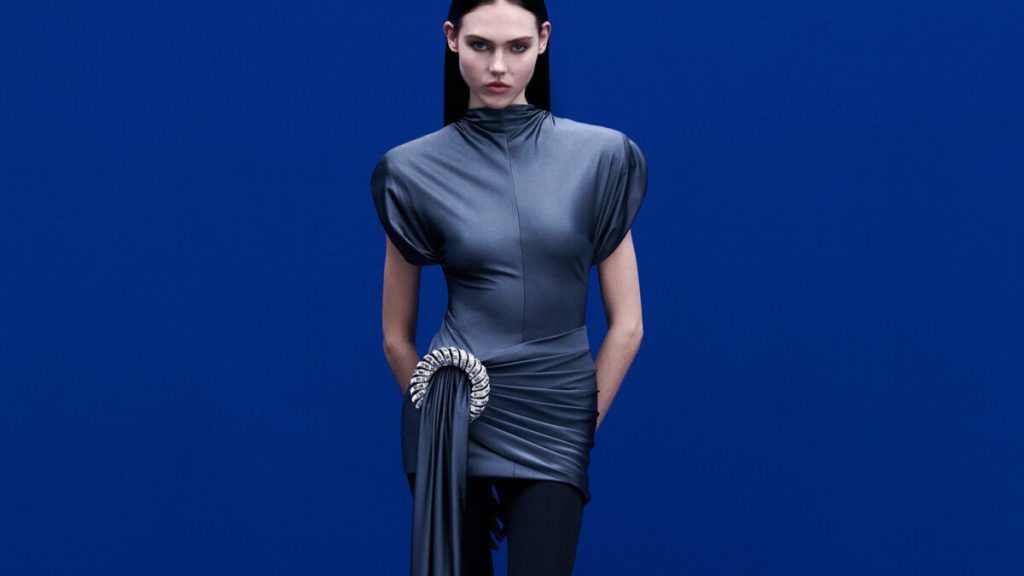 Among the key pieces are midi dresses that feature dramatic, sculpted shoulders, adding structure and power to the silhouette. Crystal-embellished tops and separates provide luxurious texture and depth, making them perfect for contemporary styling.